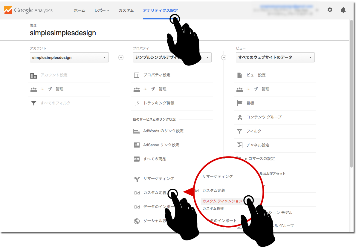 「アナリティクス設定」をクリックし、設定したいアカウントとプロパティを選択後、「カスタム定義」をクリック。項目が展開されるので、「カスタム ディメンション」をクリック。