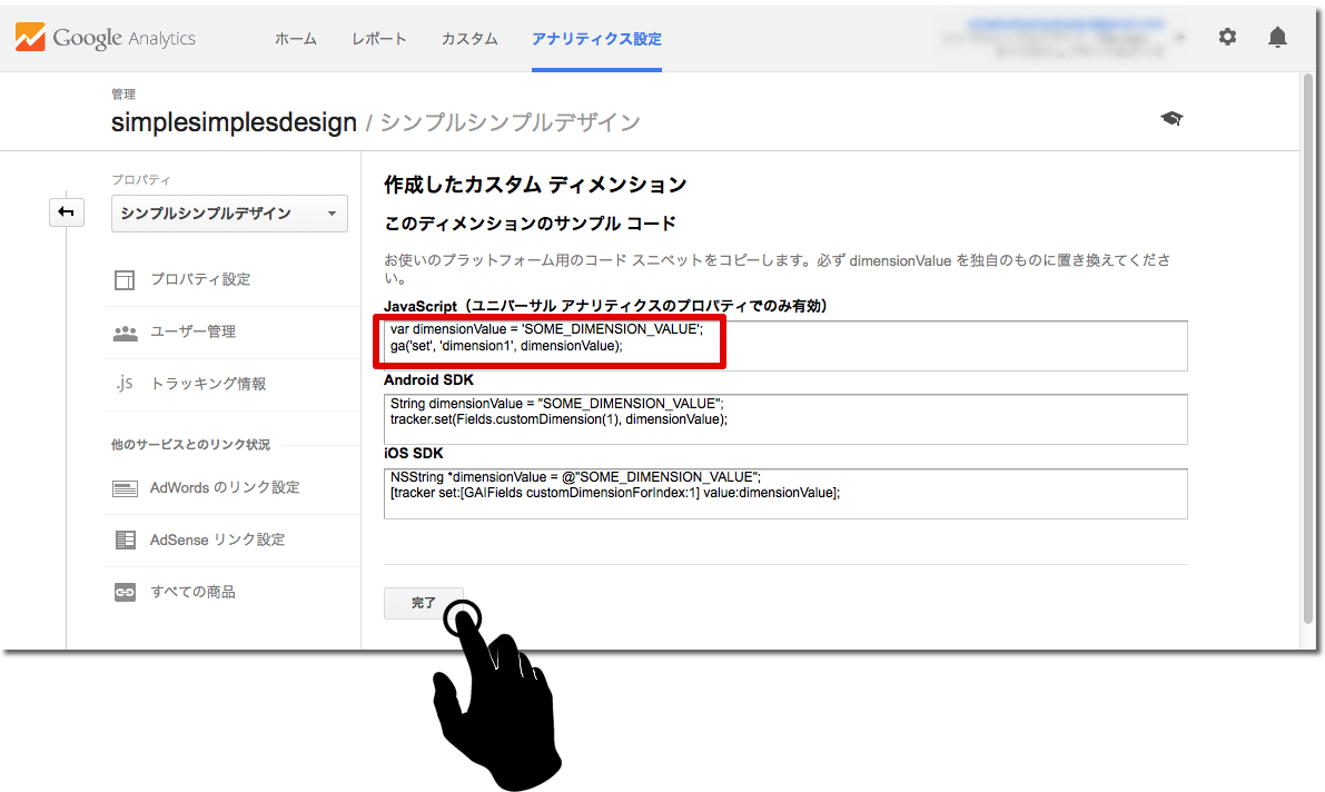 JavaScriptのコードをどこかにコピペしておいて、「完了」をクリック。