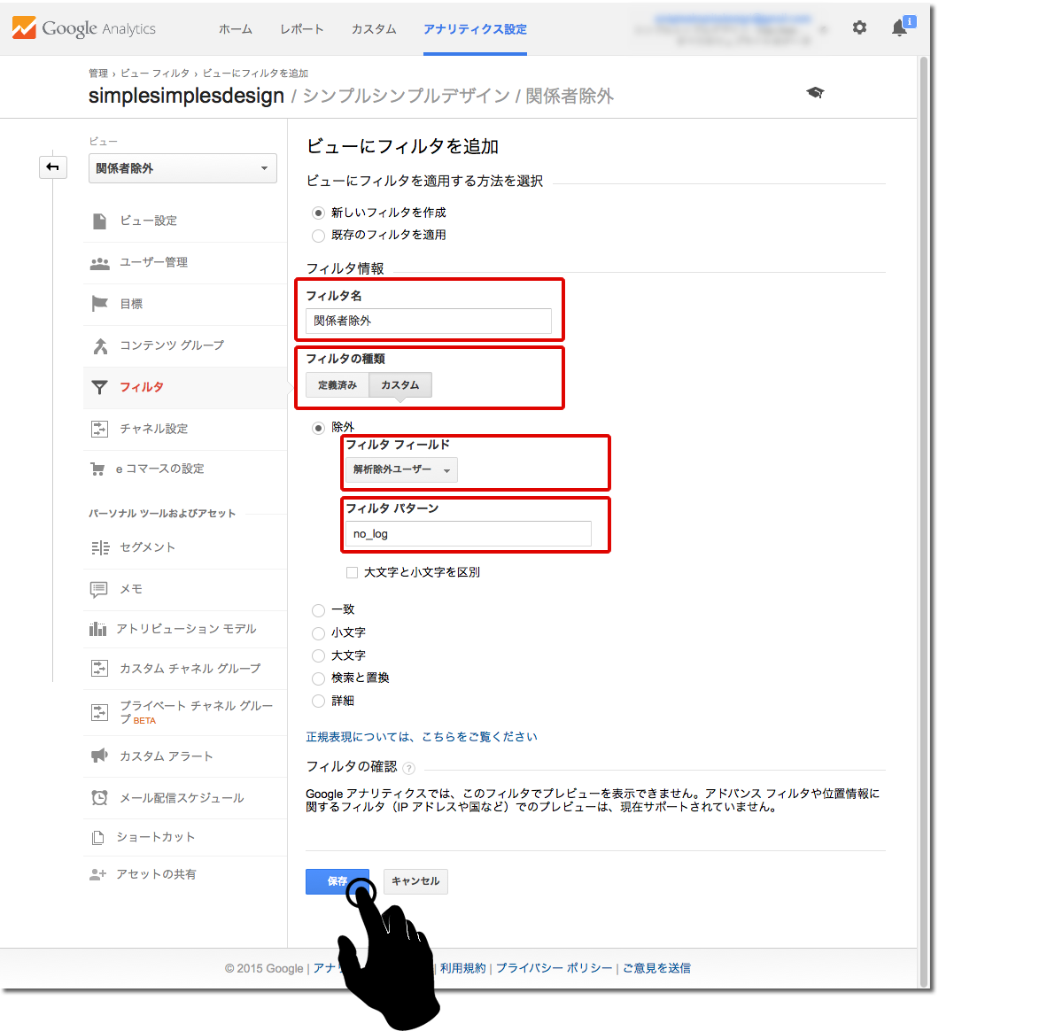 フィルタ名には任意(ここでは「関係者除外」)の名前を入力、フィルタの種類は「カスタム」を選択し、除外を選択し、フィルタフィールドには、最初にカスタム ディメンションの設定をした際の名称(ここでは「解析除外ユーザー」)を選択し、フィルタ パターンには、ログ除外用のページを用意した際に設定した名前(ここでは「no_log」)を記入して保存します。