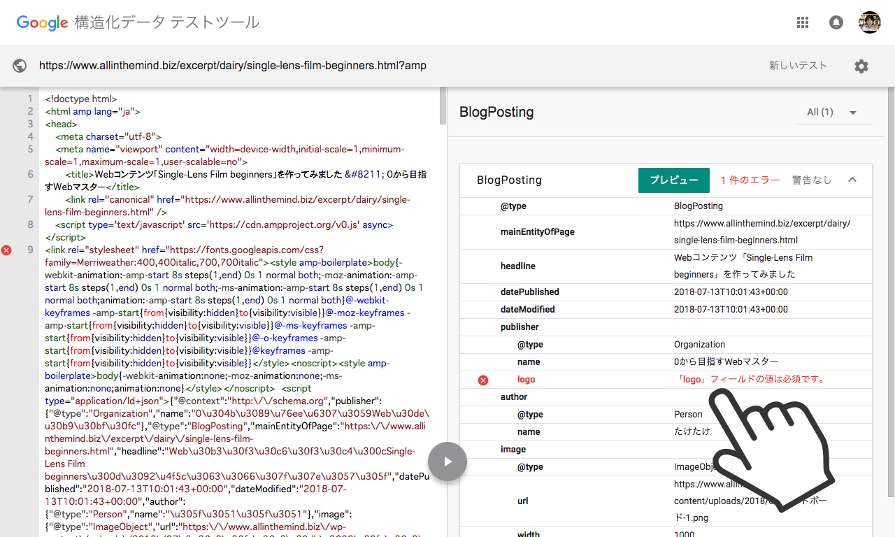 * AMPの Google構造化データテストツールで「「logo」フィールドの値は必須です。」が表示された場合