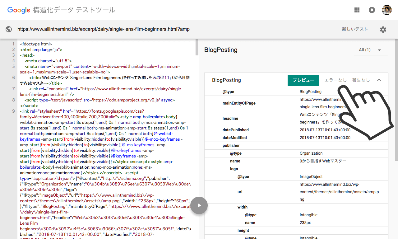 下記の画像は自動はこの例でAMP HTMLが自動で生成された画面です。